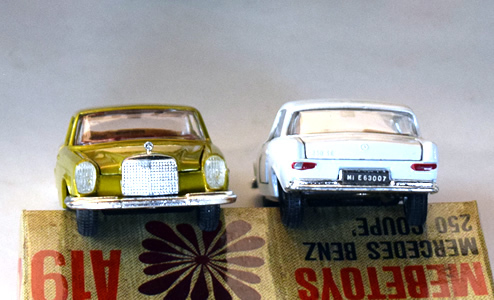 | Alle scatolette in plastica (in foto quelle col bollino rosso) si trovano abbinati modelli con interno marrone, volante cromato, leva del cambio corta, targa tedesca. | Il fondino di questi modelli è sempre quello nero, fissato con due viti. Le ruotine hanno sempre i cerchi stampati lisci. Nel motore non ci sono nè gli accessori, né i supporti. |